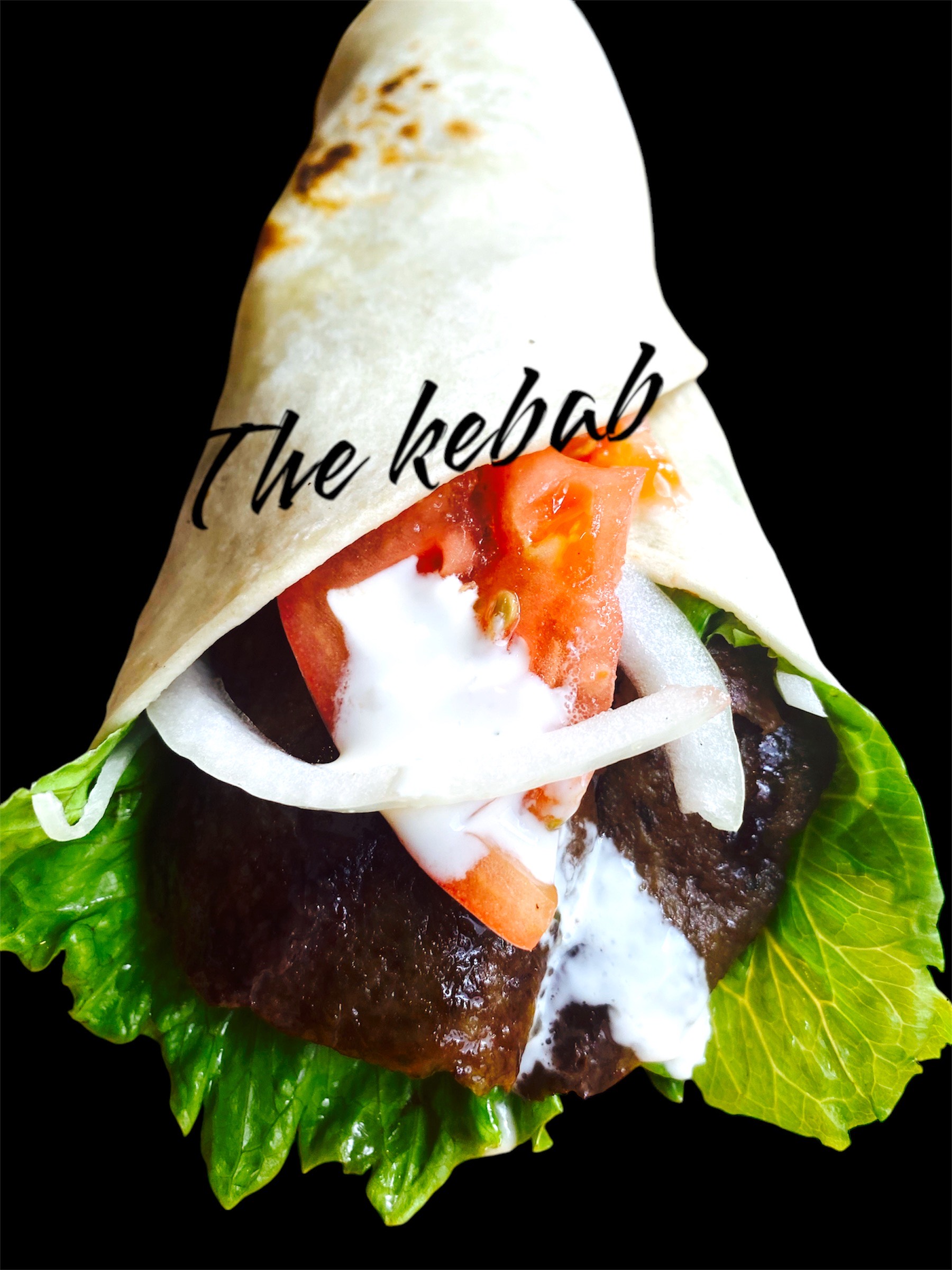 お祭りの屋台でよく見かけるビーフケバブ・レタス・トマト・玉ねぎをトルティーヤ 生地に挟んだファストフード(オリジナルソース)ケバブ専用焼き器で焼いたボリューム満点のケバブです。