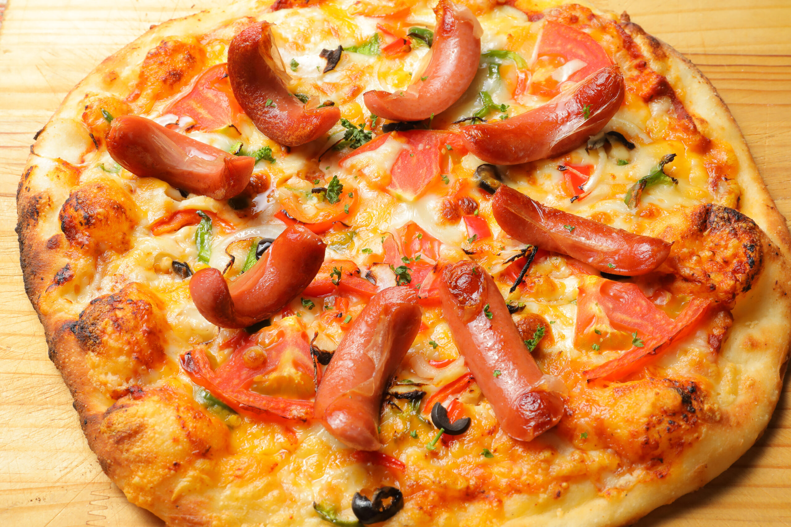 肉好きの方におすすめ!チキンソーセージがふんだんに乗ったピザです。(ポテト、トマト、ピーマン、オニオン、マヨネーズ、チーズ2種)