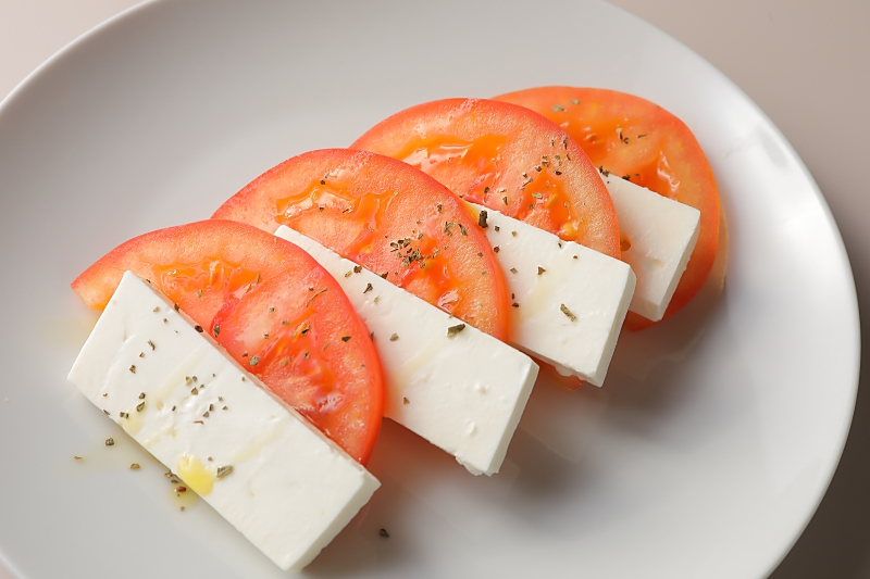 フェタチーズとトマトのサラダフェタチーズとは、ヤギと羊の乳から作られた塩味の強いチーズです。お酒のおつまみにオススメです。Feta and Tomato Salad Feta is a salty cheese made from goat and sheep’s milk. Recommended as a snack with alcohol.
