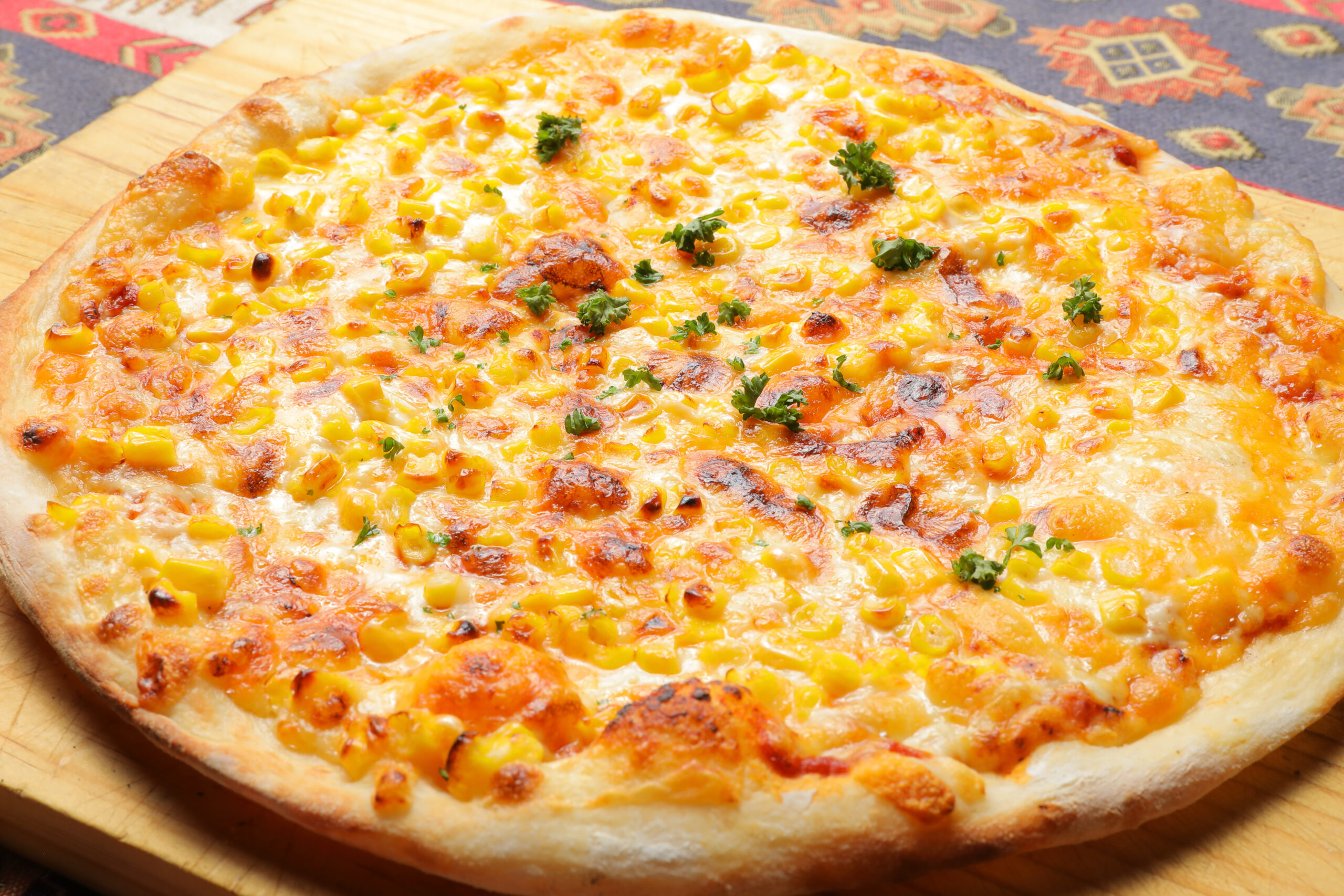 定番のマヨコーンにさらにチーズをトッピングしました!(ポテト、コーン、オニオン、マヨネーズ、チーズ2種)