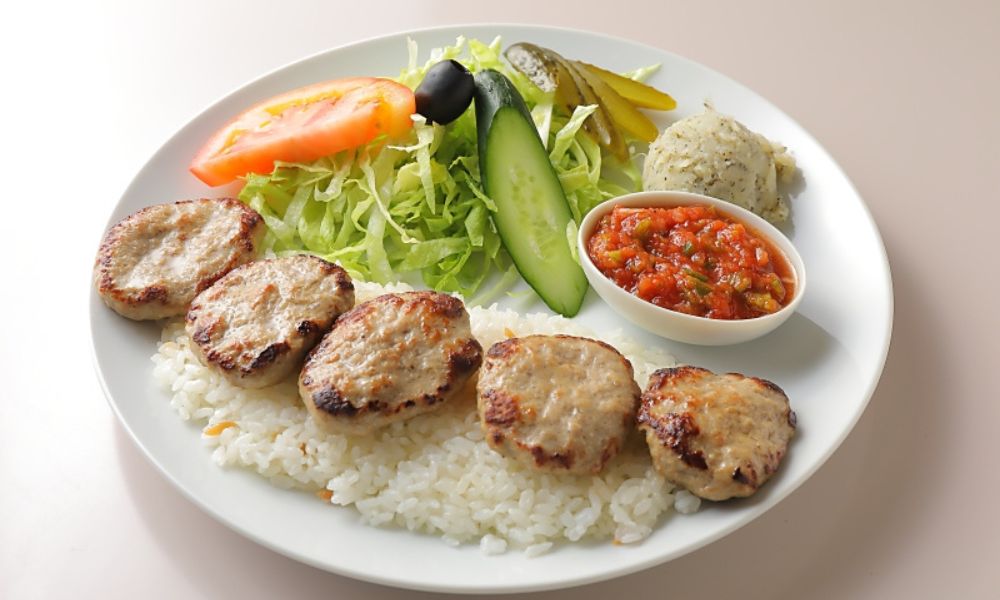 スパイシーなラム肉のハンバーグ。ラム肉が苦手な方でもクセがなく食べやすいケバブのひとつ。ラムハンバーグ・ライス250g・野菜サラダ・ピリ辛トマトの前菜・ポテトサラダのセットプレートです。